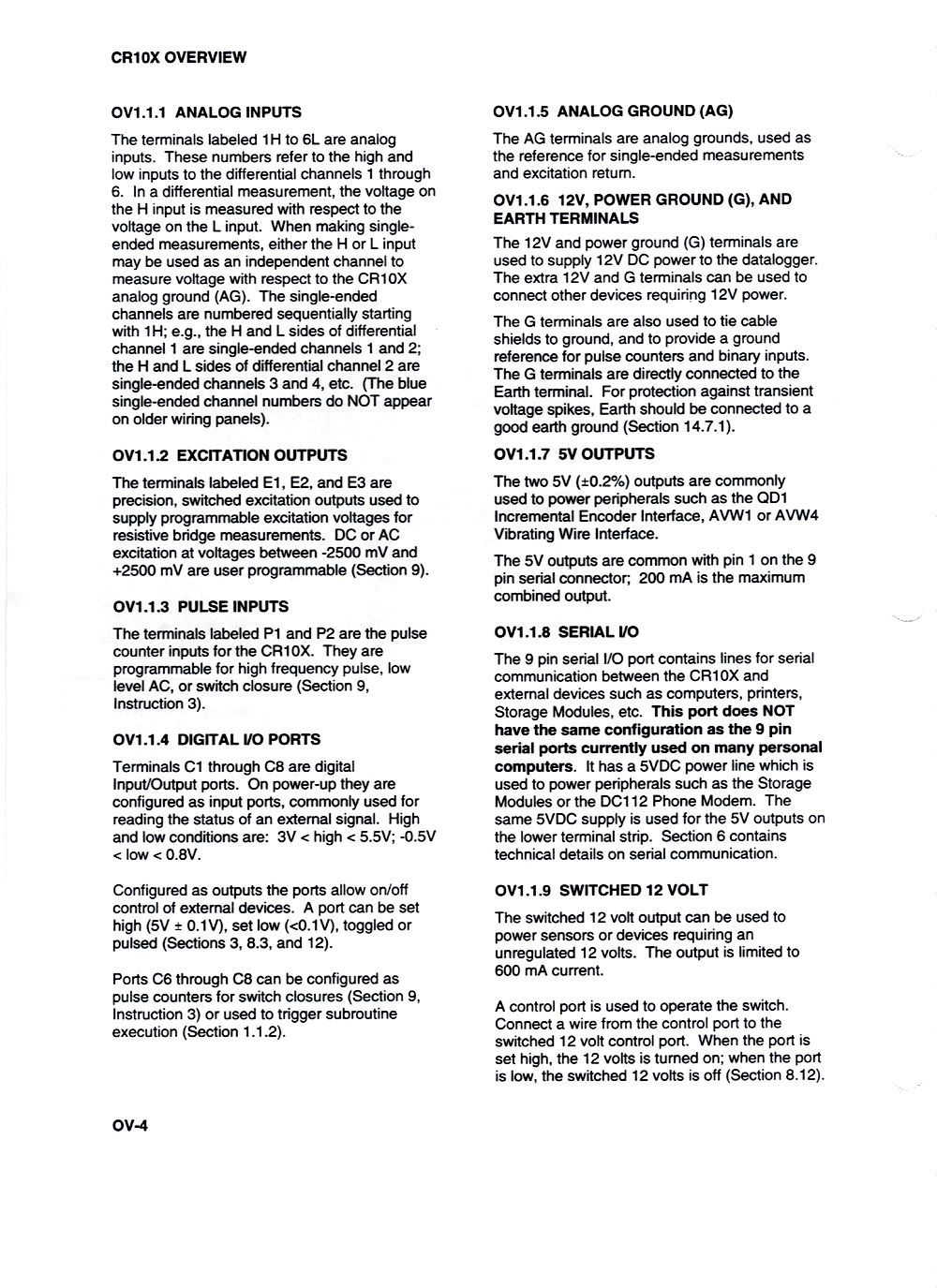 The datalogger contains a small microprocessor which runs a locally written program. It has the capability, under program control, to periodically wake-up, stimulate and control various sensors, convert analog-to-digital measurements, perform calculations and format the collected measurements into a data record.